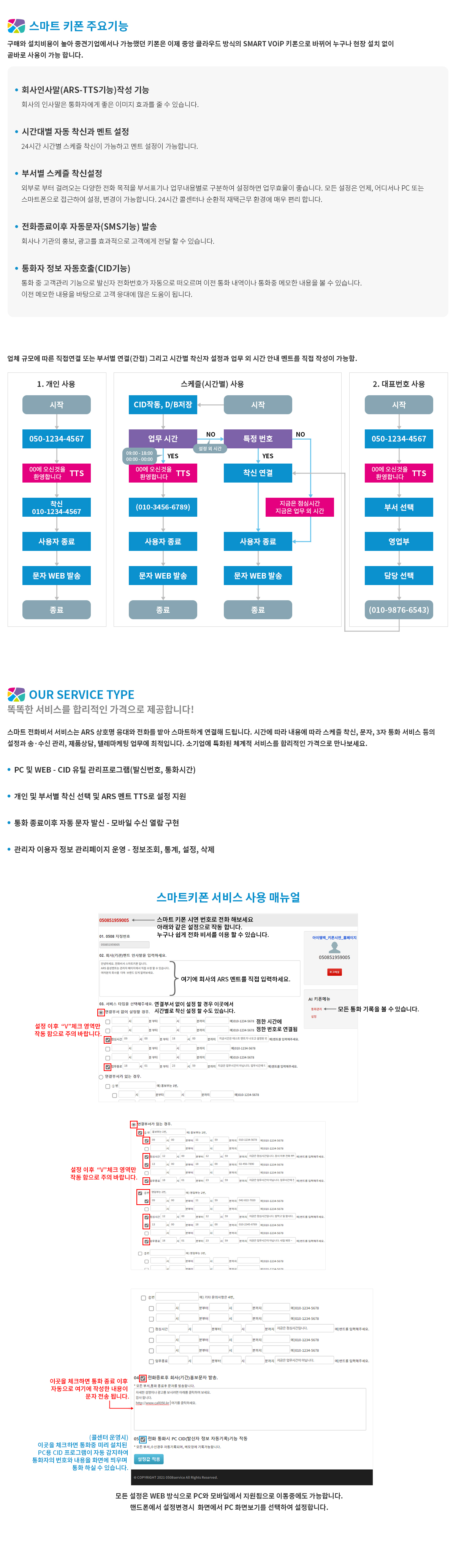 업체 규모에 따른 직접연결 또는 부서별 연결(간접) 그리고 시간별 착신자 설정과 업무 외 시간 안내 멘트를 직접 작성이 가능함.